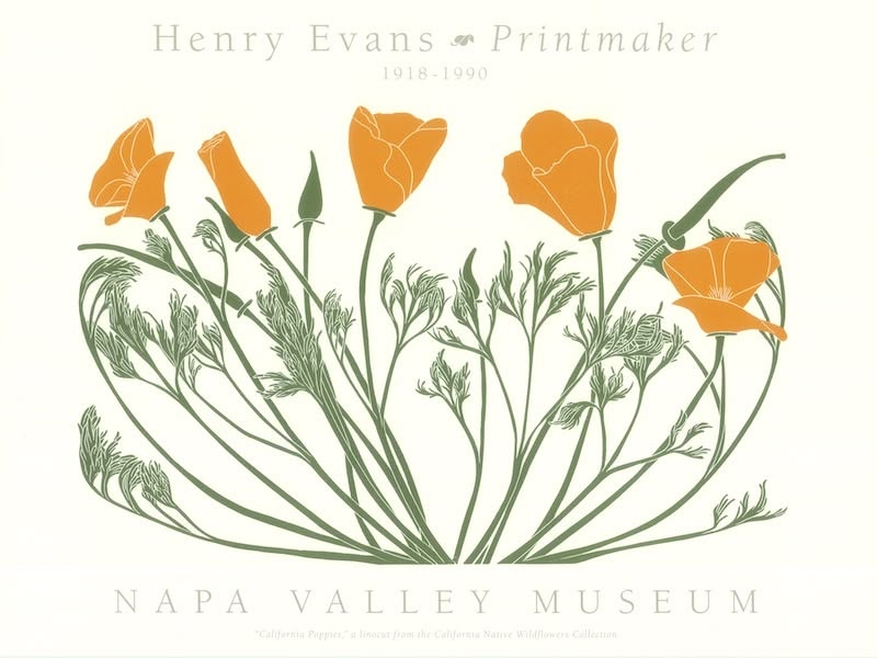 The poppies reproduced are from a linocut in the Napa Valley Museum’s collection of California Native Wildflowers by Henry Evans. This fine art poster measures 18 x 24 inches and is printed by offset lithography on acid free recycled 80# cover text paper. $30.