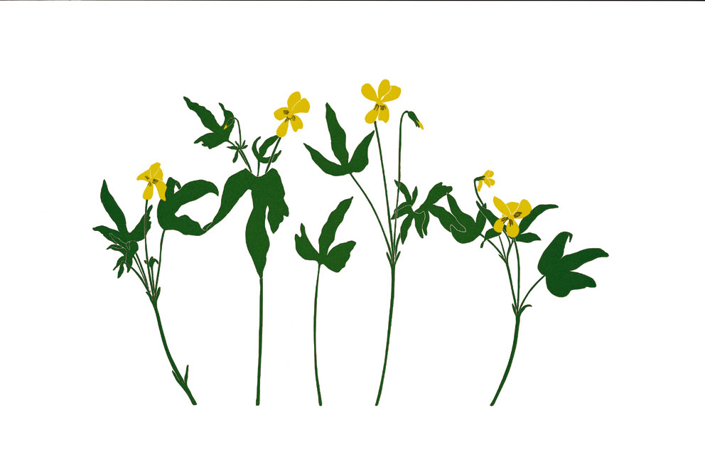 Viola lobata. Also known as the Pine Violet and the Yellow Wood Violet. This drawing was made on 2 April 1979 in our front yard in Napa County. The specimens were growing at the base of one of our Ponderosa pines. Some people seem to have the idea that violets are only blue or purple, or violet- colored. Many are, but some of our handsomest native violets in California are yellow. Believed to be first collected by Karl Theodor Hartwig in 1846 or 1847. The first published description appeared in 1848. —Henry Evans